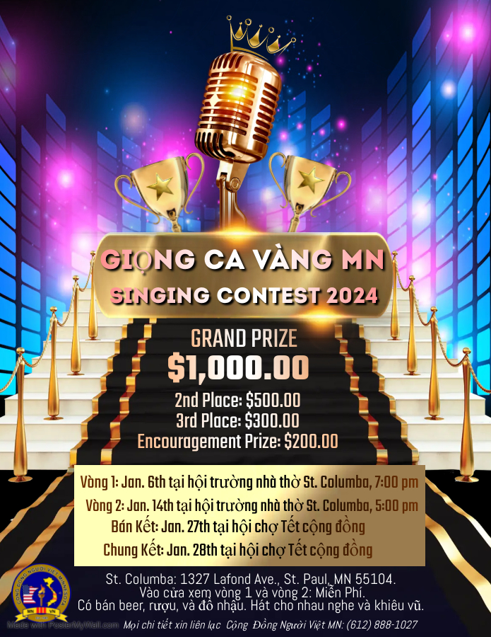 Giọng Ca Vàng Minnesota 2024 Registrations have closed. Giọng Ca Vàng Minnesota 2024 752 752 people viewed this event. Date And Time 2024-01-06 @ 07:00 PM to 2024-01-06 @ 12:00 AM Location St. Columba Church Event Types Concert or Performance Event Category Game or Competition Share With Friends Facebook Twitter Linkedin Xing Pinterest